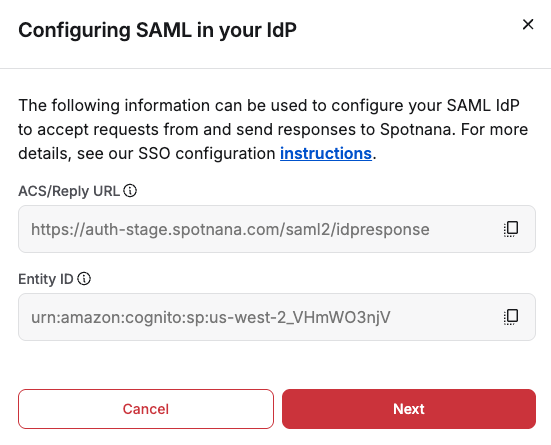 These instructions explain how to configure Spotnana to connect to your Identity Provider (IdP) to support Single Sign-on (SSO). Once configured, your users will no longer need to enter a Spotnana-specific user ID and password and will instead use SSO to access Spotnana. To configure Spotnana to support SSO, there are some steps that must be completed (one time only). The steps are organized into 3 sections: