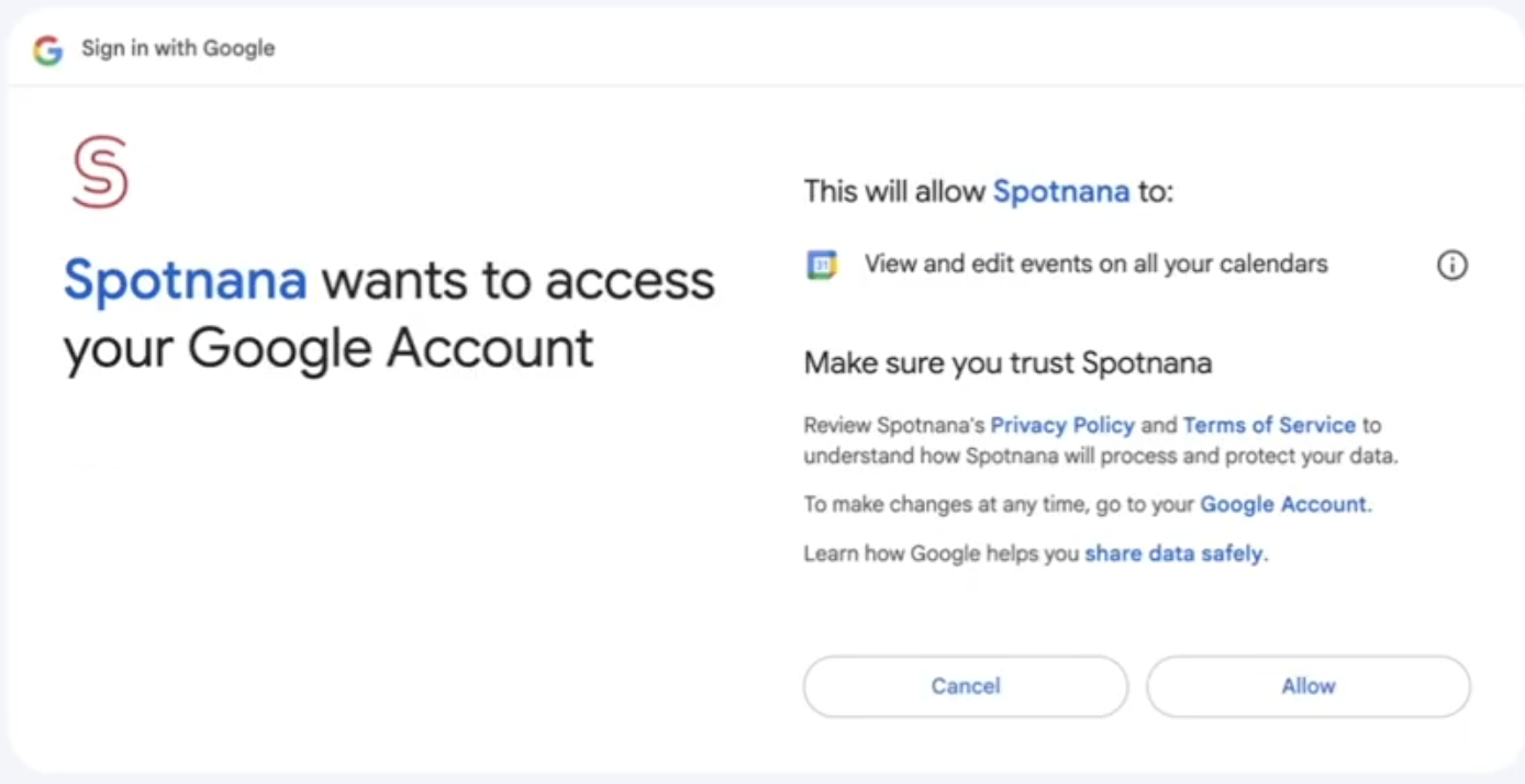 Spotnana’s Google Calendar integration uses a verified OAuth 2.0 client (a secure authorization setup registered with Google that governs the data Spotnana can request and how users grant access). This client is configured in our Google Cloud account in accordance with Google’s required standards for third-party access to user data.