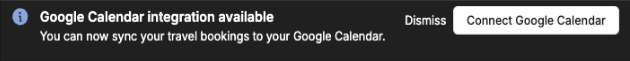 Once connected, the Connect Google calendar option will appear on the Spotnana home page for all travelers within your company. Please instruct your travelers to enable this option.