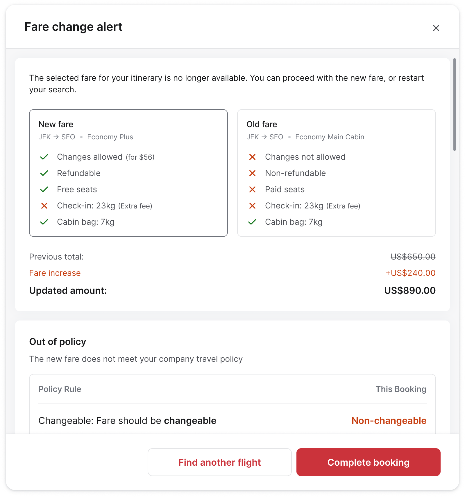 If the price of a flight changes during the checkout process, the traveler booking the fare will receive a notification that the fare has changed with the option to proceed or start a new fare search. If the fare has increased enough to cause it to now be out of policy, the traveler may be required to provide a reason code in order to proceed.